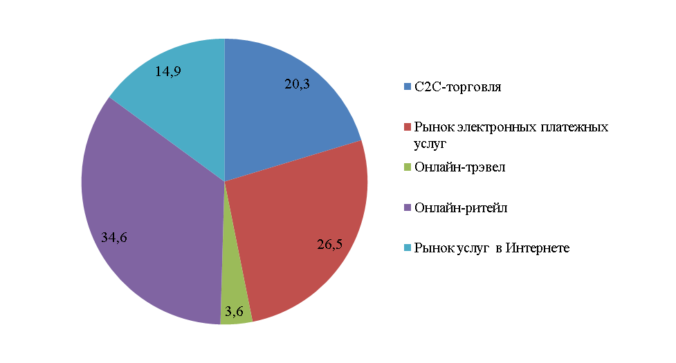 Как видно из данных рисунка 5, наиболее крупным рынком является рынок онлайн-ритейла (продаж товаров через сеть Интернет), формирующий 34,6 % сегмента электронной коммерции. На долю рынка услуг в Интернете приходится соответственно 14,9 % (при этом наиболее крупными составляющими рынка услуг в Интернете являются услуги такси и каршеринга, а также услуги доставки готовой еды и продуктов. Объем продажи транспортных услуг через Интернет в 2022 г. вырос на 40 %, а услуг доставки готовой еды и продуктов – на 47 %), на рынок онлайн-трэвел – 3,6 %. Большим потенциалом развития обладает также С2С-торговля, на которую по итогам 2022 г. пришлось 20,3 % общей емкости сегмента электронной коммерции в России.