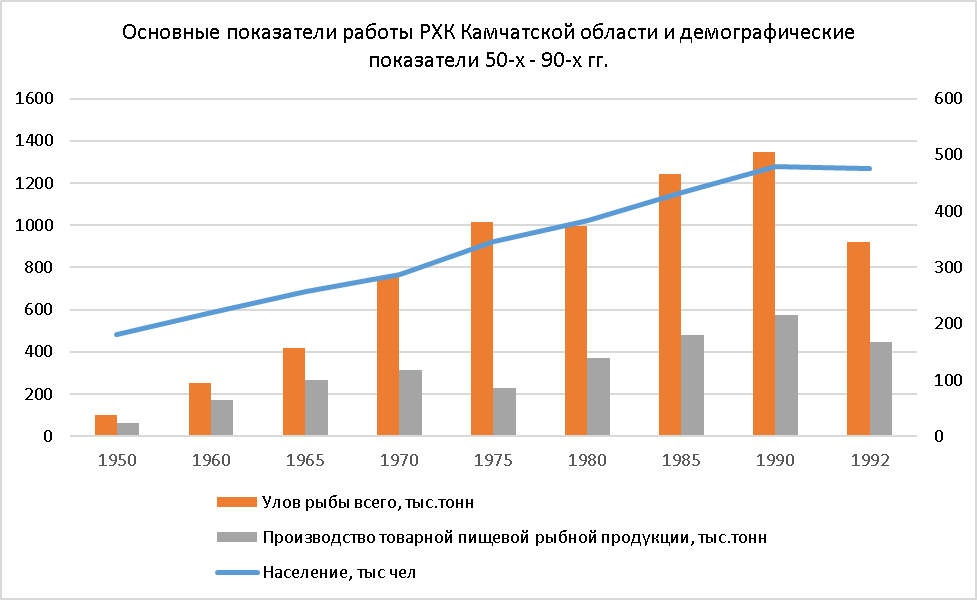 Демографический потенциал Камчатки в советский период характеризуется активным ростом – от 180 тыс. человек в 1950 году до 478, 7 тыс. к 1990 г. – в 2,7 раза. Как видно из графика, начавшиеся преобразования начинают негативно сказываться, и к 1992 г. все показатели начинают снижаться.