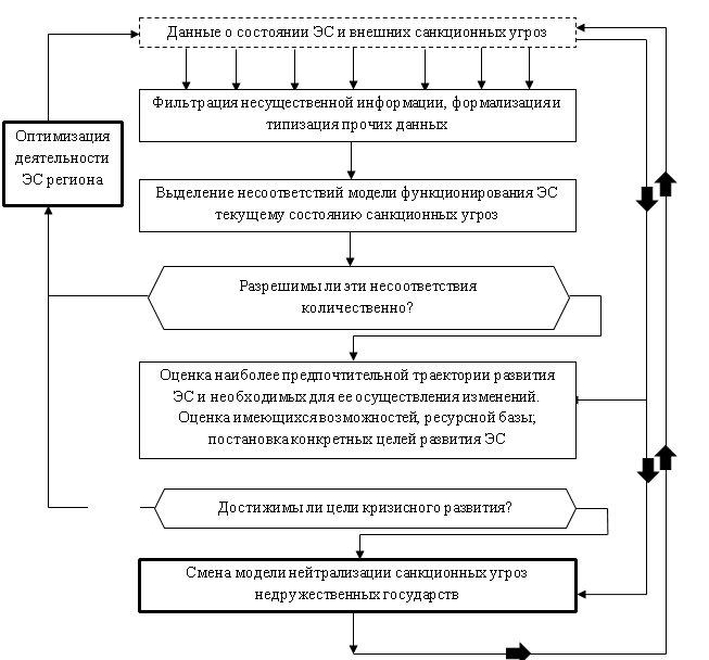 Данные, описывающие имевшие место изменения состояния экономической безопасности экономической системы регионов ПФО Российской Федерации на протяжении последних двух десятилетий, свидетельствуют о последовательном ухудшении такого состояния с 2010 г. и служат существенной актуализации необходимости разработки и осуществления комплекса мероприятий, направленных на изменение сложившейся ситуации и противодействие внешним санкционным угрозам экономической безопасности ПФО. Вопрос развития антикризисного управления региональными экономическими системами является актуальным в условиях санкций недружественных государств по нескольким причинам. Санкции могут оказать негативное влияние на экономику региона и привести к ухудшению экономической ситуации. В таких случаях необходимо более оперативно реагировать и принимать меры для минимизации негативных последствий. Развитие антикризисного управления региональными экономическими системами может помочь предотвратить возникновение кризисных ситуаций в будущем. Это позволит своевременно выявлять проблемы и разрабатывать эффективные стратегии их решения. Методология антикризисного управления региональными экономическими системами может способствовать укреплению экономических связей между странами и повышению конкурентоспособности экономики региона. Таким образом, развитие антикризисного управления региональными экономическими системами является необходимой мерой для обеспечения стабильности и устойчивости региональных экономик в условиях санкций недружественных государств. Рассмотренные выше аспекты фактически образуют собой основу алгоритма принятия любых стратегических решений в управлении и, безусловно, должны учитываться не только в откровенно кризисных ситуациях, но и в нормальном повседневном режиме деятельности экономической системы региона (Рисунок 1).
