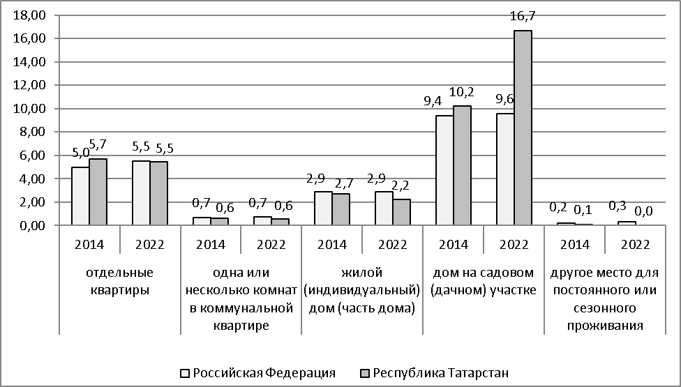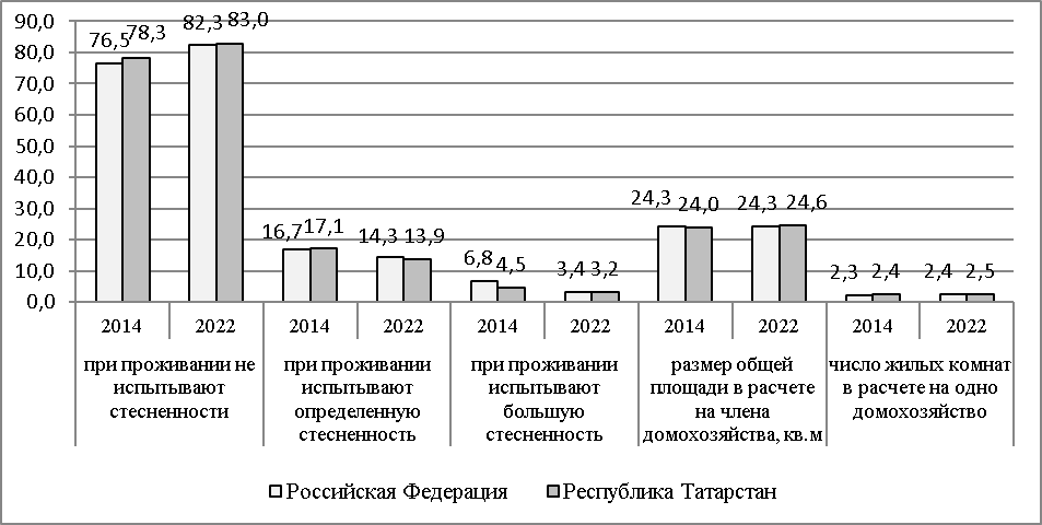 Методы исследования. Объектом исследования являются условия жизни населения Республики Татарстан. В качестве исходных данных для сравнительной оценки использованы результаты Комплексного наблюдения условий жизни населения Росстата (КОУЖ) [8]. Комплексное наблюдение условий жизни населения Росстата проведено выборочным методом во всех субъектах Российской Федерации с охватом 60 тыс. домохозяйств. Сравнение показателей, характеризующих жилищные условия проживания населения Республики Татарстан, выполнено нами за 2014-2022 гг. Рассматриваемые жилые помещения включают индивидуальный дом, квартиру, комнату в коммунальной квартире, общежитии или в др. жилом строении.