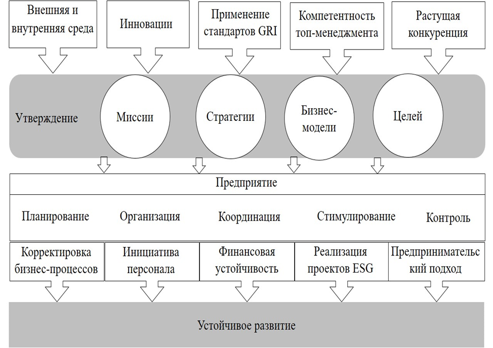 В настоящее время отечественные компании вынуждены функционировать в условиях высокой неопределенности. Которая обусловлена как экономическими, так и социальными и экологическими причинами. В связи с этим становится актуальной повестка ESG (Environmental, Social, Governance), которая призвана трансформировать внутренние процессы организации для минимизации воздействия факторов внешней среды. В связи с этим любое предприятие России должно формулировать стратегию и бизнес-модель, основываясь на концепции устойчивого развития для того, чтобы выстроенные бизнес-процессы обеспечивали эффективноеуправление во всех сферах ее функционирования.