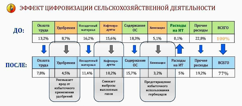 Согласно информации, предоставленной Аналитическим центром Минсельхоза России, применение цифровых технологий в экономике приводит к улучшению экологической ситуации и уменьшению расходов до 23% [2].