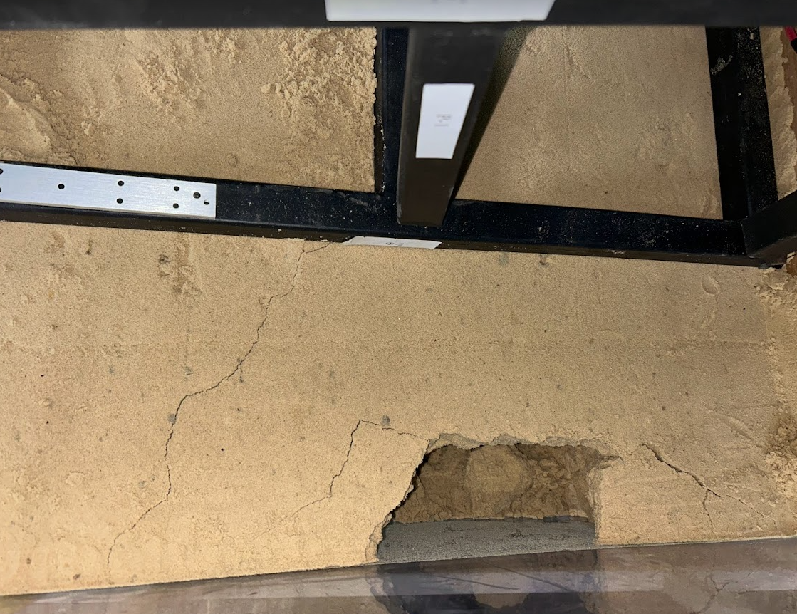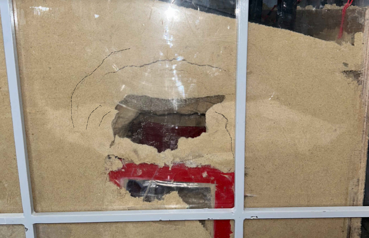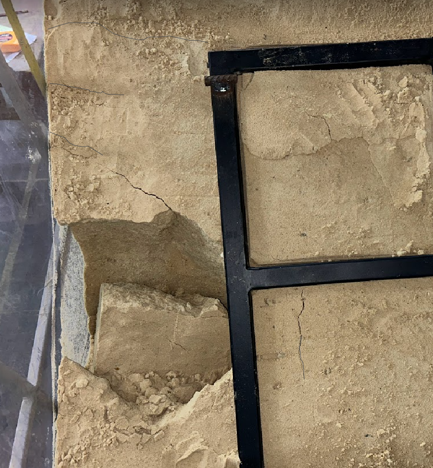 - В случае расположение карстовой полости не под геометрическим центром модели фундамента, то происходит противоположный эффект, в результате которого значительно увеличивается диаметр воронки, с увеличением образующих призмы обрушения, вследствие чего появляется существенный крен модели фундамента, вплоть до его смещения в сторону воронки.