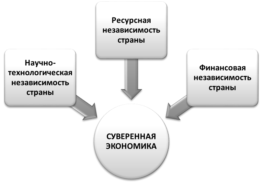 Обобщая и дополняя определения, приводимые в научных трудах, можно сформулировать следующую дефиницию: суверенная экономика представляет собой такую экономическую систему, которая функционирует в условиях независимости государства от внешнего вмешательства и контроля, которое обладает необходимыми ресурсами и технологиями для реализации самостоятельной социально-экономической политики и обеспечения экономической безопасности страны. Однако важно подчеркнуть, что формирование суверенной экономики возможно только в условиях крупного государства, более того, экономический суверенитет, как показывает мировая практика, должен подкрепляться значительным военным потенциалом.