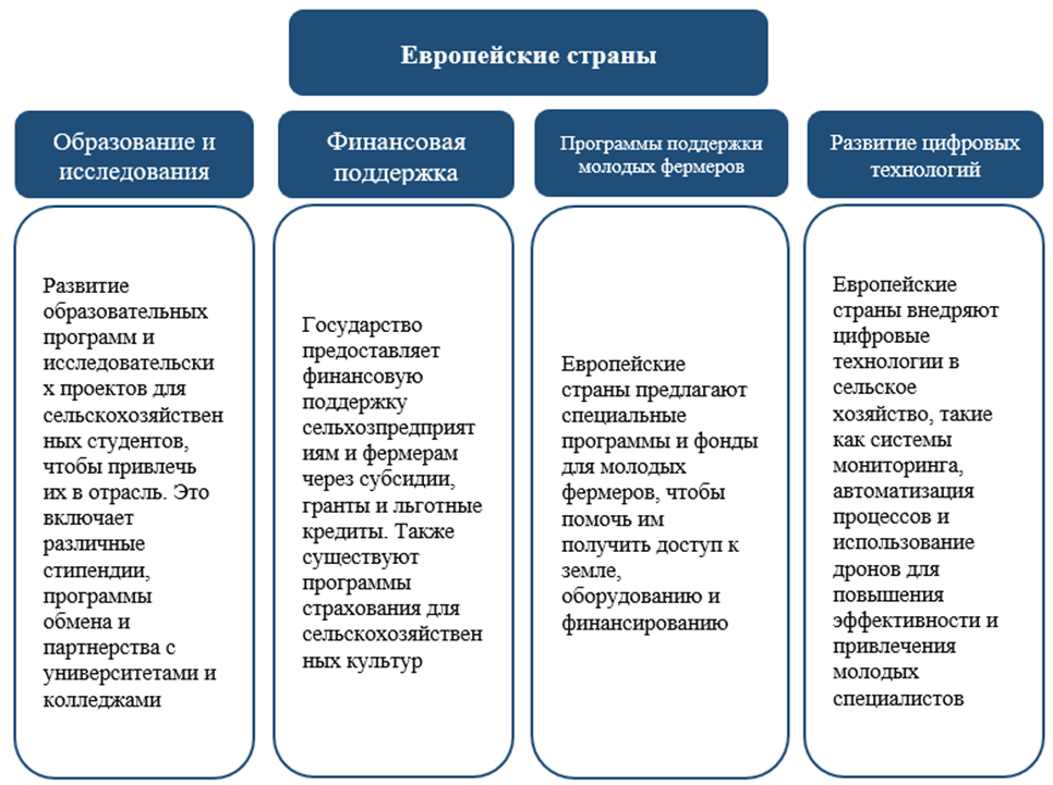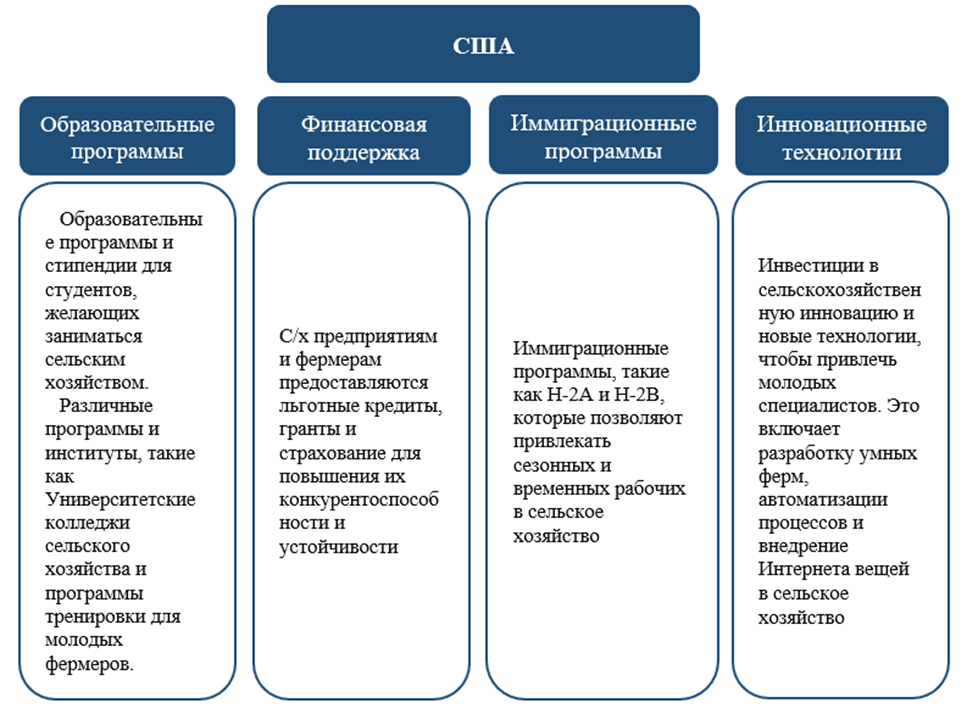 Зарубежный опыт привлечения специалистов в сельскохозяйственную отрасль был изучен на данных США, стран Европы и Китая. Все эти страны активно применяют различные методики для развития отрасли сельского хозяйства. Так, например, в США создаются образовательные программы и выделяются стипендии для студентов, которые хотят заниматься сельским хозяйством, предоставляется финансовая поддержка фермерам, активно внедряются инновационные технологии в сельскохозяйственную деятельность (рисунок 1).