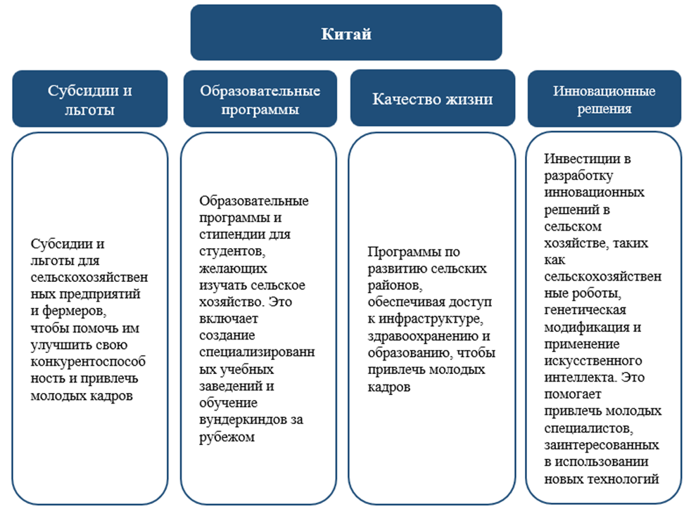 В Китае предоставляются субсидии и льготы для предприятий сельского хозяйства для привлечения молодых специалистов и повышения конкурентоспособности. Создаются специализированные учреждения для желающих изучать сельское хозяйство. Реализуются программы по улучшению сельских территорий, создание благоприятной инфраструктуры, инновационные решения также играют важную роль, как и инвестиции в разработку этих решений.