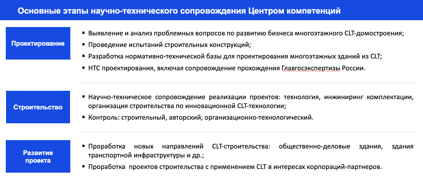 Деятельность Центра компетенций не будет ограничиваться технологией CLT, а будет направлена на поиск, развитие и вывод на рынок оптимальных технологий индустриального деревянного и композитного домостроения.