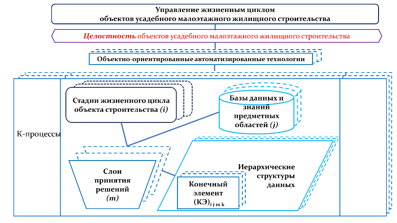 Управление жизненными циклом объектов усадебного малоэтажного жилищного строительства (ОУМЖС) требует наличия объектно-ориентированных автоматизированных технологий такого строительства. Создание моделей технологий, их реализация в работающие образцы сопряжено с описанием мета-структуры таких технологий, состоящей из множества иерархических структур данных помещений, конструкций, инженерного оборудования и других конечных элементов, для определения которой вводится понятие целостности ОУМЖС в составе жилых домов, гаражей, бань, веранд, различных хозпостроек. Объектом исследования статьи выступают иерархические структуры данных, на основе которых формируются объектно-ориентированные базы данных и базы знаний, обслуживающие автоматизированные технологии порождения целостности для всех стадий жизненного цикла строительных объектов: инженерных изысканий, проектирования, строительства, эксплуатации и утилизации. Такая декомпозиция целостности ОУМЖС на иерархические структуры данных, позволяет выявить все предметные области ОУМЖС для расчетных обоснований предельных состояний конечных элементов (объектов) архитектуры, строительных конструкций, инженерного оборудования.