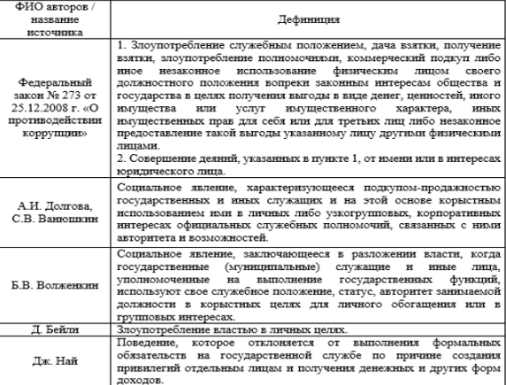 Проблематика коррупции как социально-экономического явления находит свое отражение в трудах отечественных и зарубежных ученых, подходы которых отражены в таблице 1.