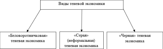 Так как характер и последствия деятельности в сфере теневой экономики варьируются в очень масштабных пределах, выделяют следующие ее виды, представленные на рисунке 1.