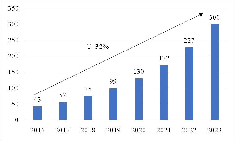 Рисунок 2 – Динамика мирового рынка смарт-контрактов, млн. долл. [14]