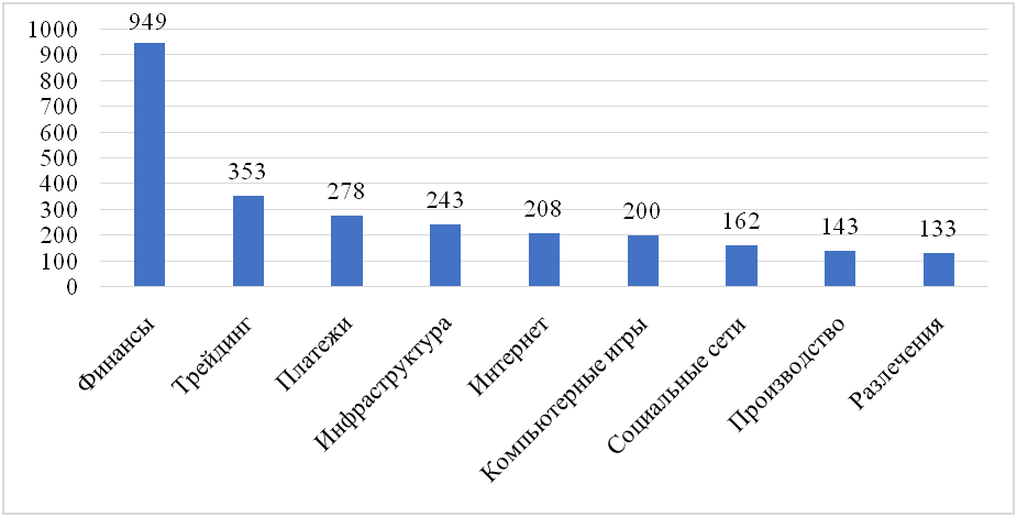 Данные рисунка 3 показывают, что больше всего проектов для финансирования через распределенные реестры и смарт контракты (по ICO) приходится на финансовую сферу (сектор Финтеха) – 949 проектов. На втором месте располагается сфера привлечение инвестиций в трейдинг (353 проекта), на третьем месте платежи (278 проектов). Далее следуют проекты для привлечения финансирования в развитие инфраструктуры (243 проекта), Интернета (208 проектов) и компьютерных игр (200 проектов).