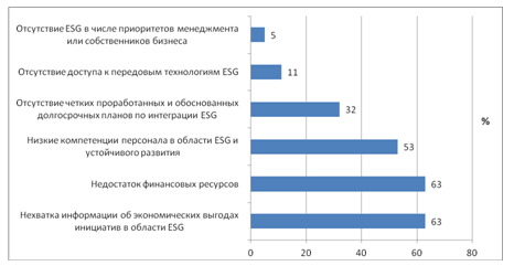 Таким образом, около 2/3 предприятий АПК (63%) указывают на отсутствие достоверной информации о финансовых выгодах ESG-инициатив, а также затруднения из-за нехватки финансовых средств. Более половины (53%) отмечают нехватку знаний и компетенций в области ESG и устойчивого развития среди своих сотрудников. 32% опрошенных выделяют отсутствие конкретизированной стратегии по ESG внутри своей организации. Также, небольшая доля (11%) сталкивается с проблемой доступа к передовым технологиям в сфере ESG и 5% организаций признают, что ESG-инициативы не находят отклика у высшего руководства или владельцев. [7, с. 22]