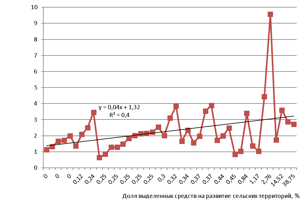 Зависимость описывается уравнением линейной кривой y=0,04x+1,32 с коэффициентом достоверности R²=0,4, который свидетельствует о среднем уровне зависимости. Полученное уравнение показывает, что увеличение доли выделения средств на развитие сельских территорий на 1% (21 млн руб.) соответствует росту производства сельскохозяйственной продукции 1,32% (3284,3 млн руб.).