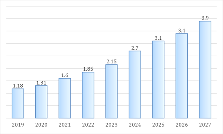 В современной экономике актуальность темы цифровизации как в глобальном аспекте для стран и регионов мира, так и для отдельных компаний, приобретает все большую значимость. Цифровизацией принято называть процесс внедрения цифровых технологий в самые различные сферы деятельности: бизнес, производство, образование, здравоохранение и т.д. К главным преимуществам относят оптимизацию бизнес-процессов, повышение качества продукции и услуг, повышение эффективности работы и управления, улучшение кибербезопасности [5]. Использование таких инноваций как искусственный интеллект, облачные услуги и автоматизация процессов позволяет компаниям быть более адаптивными к изменениям на рынке и повышает их устойчивость. Также активно используются технологии беспроводной связи, виртуальной и дополненной реальности, блокчейн, Интернет вещей, трехмерной печати. Однако следует сразу отметить, что без финансирования странами и крупными международными компаниями комплекса мероприятий по созданию необходимых условий для развития цифровизации и внедрения цифровых технологий в практическую деятельность экономических субъектов было бы невозможно развивать современную экономику. Актуальность цифровизации экономики для всех экономических субъектов особенно ярко проявилась в период пандемии Covid-19. В 2020 году большое количество предприятий начало использовать процессы цифровизации, которые в 2021 и 2022 годах принял усиленный характер из-за пандемии Covid-19 [7]. Она заставила компании ускорить процессы изменений и расширять бюджет на цифровые изменения, которые с каждым годом становятся масштабнее. На рисунке 1 представлены данные по глобальным расходам на цифровизацию, начиная с 2019г. и на перспективу 2027г..