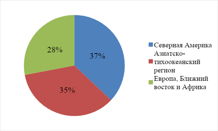 Согласно опросу Global Tech Trends Survey 2022 года, для компаний 84% респондентов из региона AMER цифровизация является главным приоритетом для технологического статуса [15]. На втором месте Азиатско-Тихоокеанский регион, где доля респондентов с аналогичным заявлением составляет 82%. За ним следует регион EMEA с 76% соответственно. Распределение расходов по регионам демонстрирует глобальный характер цифровизации (рисунок 2).