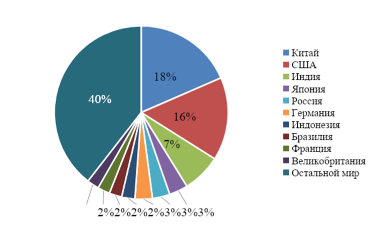Анализируя основы мирового ВВП, можно выделить пять ключевых стран, на долю которых приходится почти половина от общего показателя. Это Китай, Соединенные Штаты Америки, Индия, Япония и Российская Федерация. При добавлении следующих пяти стран в список, общая доля первой десятки стран достигает 60,49% от мирового ВВП. Таким образом, наибольший вклад в ВВП принадлежит странам Азиатско-Тихоокеанского региона (31,64%) и региону Северной Америки (вклад США составляет 15%) [13].