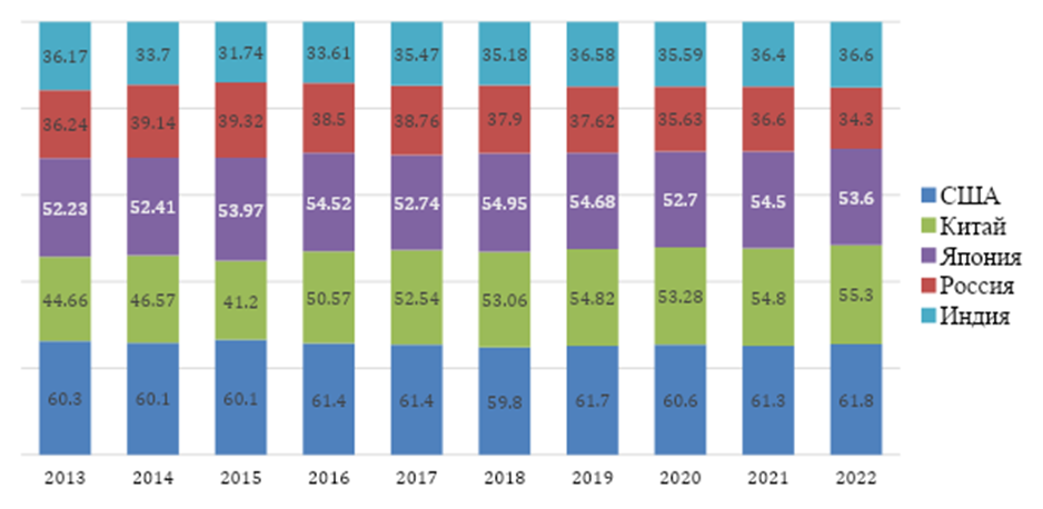 Рисунок 4 - Уровень цифровизации стран, за период 2013 – 2022 гг., баллы [10]