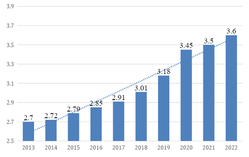 Рисунок 6 – расходы на инвестиции и разработки в США в % от ВВП, за период 2013 – 2022 гг., баллы [10]