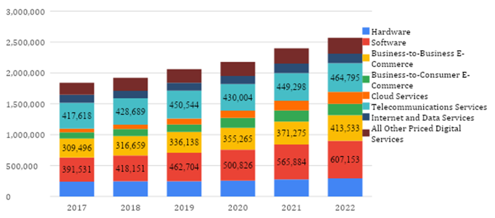 Согласно данным Бюро экономического анализа США, реальная добавленная стоимость цифровой экономики ежегодно увеличивалась на 6,3% в период с 2017 по 2022 год, что значительно превышает общий рост экономики на 1,9%. В 2022 году доля цифровой экономики составила 6,3% от ВВП, а в 2020 году она достигла отметки в 6,5% от общего ВВП, в то время как общий реальный ВВП сократился на 2,2% [19].