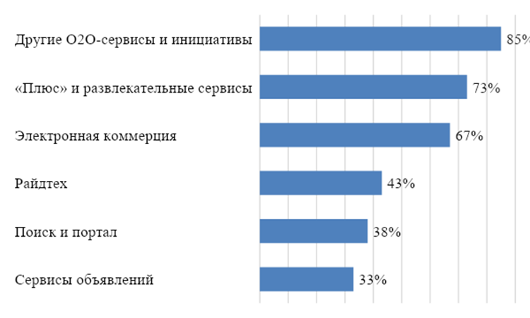 В России цифровизацию экономики практически полностью обеспечивает компания Яндекс. Она выделяет 6 отчетных сегментов бизнеса – поиск и портал, райдтех, электронная коммерция, «Плюс» и развлекательные сервисы, сервисы объявлений, другие О2О-сервисы и инициативы [18]. В последний сегмент входят бизнес по беспилотным автомобилям, Yandex Cloud, «Образование», «Устройства», «Финтех» и другие экспериментальные и нераспределенные направления. Доля данного сегмента в общей выручке группы составила 16% к концу 2022 года. Данный сегмент демонстрирует наибольший прирост выручки (рисункок10).