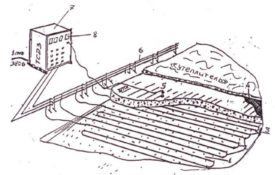 Обозначения: 1 — песчаное (щебёночное) основание; 2 — нагревательные провода, 3 — штыри; 4 — толь; 5 — температурный датчик; 6 — шинопровод; 7 — трансформатор; 8 — измеритель-регулятор.
