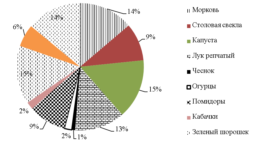 Специфической особенностью отрасли также является то, что более 70% объемов производства овощей обеспечивается хозяйствами населения, крестьянскими (фермерскими) хозяйствами и индивидуальными предпринимателями [5].