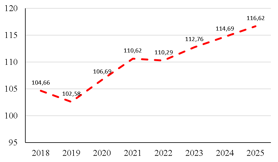Анализируя динамику индекса потребительских цен на продовольственные товары (Рисунок 1), можно сделать вывод, что в 2023-2025 гг. ожидается увеличение данного показателя.