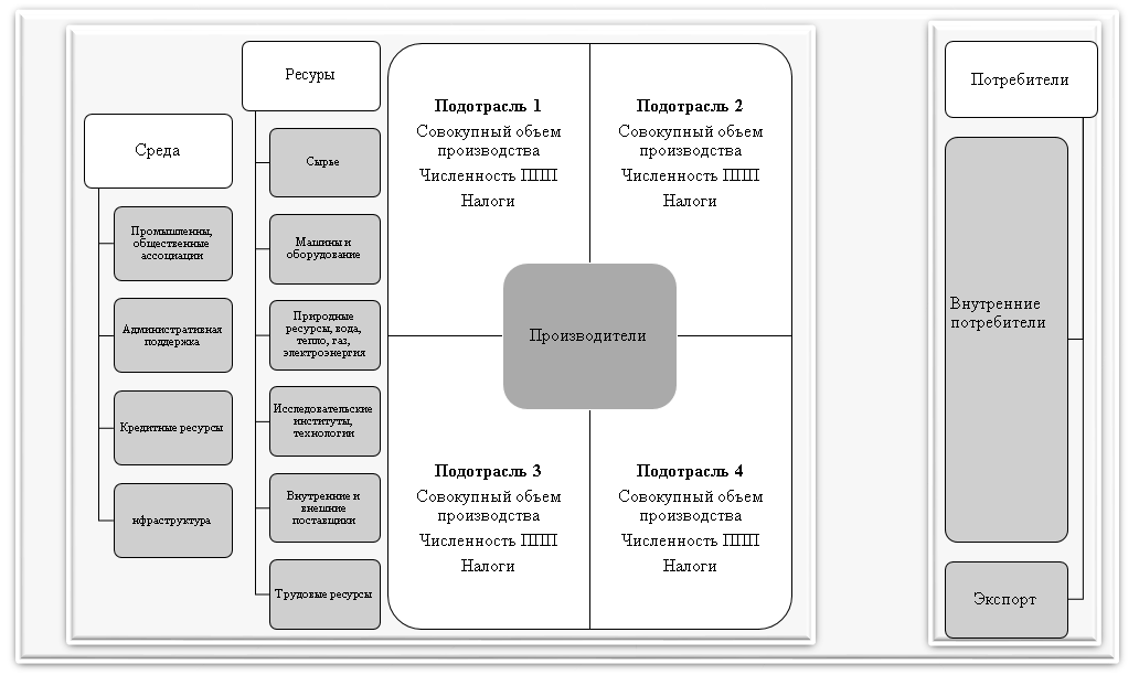 Таким образом, была сформирована модель кластера, которая учитывает внешних поставщиков и потребителей. Данную модель можно использовать для любой отрасли, её главная цель - методологический анализ перспектив развития кластера в условиях внешнего влияния.