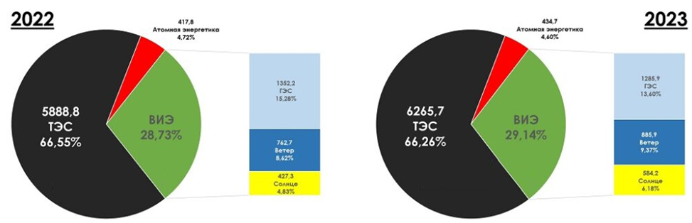 Рисунок 2 – Структура выработки электроэнергии в Китае в 2022 – 2023 г.г. (ТВт/ч и %)