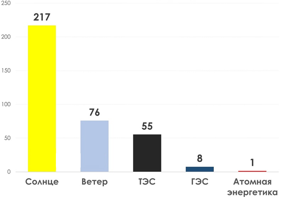 Китайские инвесторы делают ставку на солнечную генерацию, вложения в которую позволили увеличить ее установленную мощность в одном только 2023 г. на 217 ГВт/ч. Отметим, что объемы ввода установок ветряных станций, а также классических тепловых генерирующих мощностей являются также впечатляющими и составили 76 и 55 ГВт/ч соответственно (Рисунок 3).