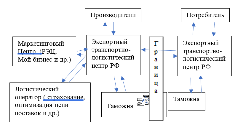По нашему мнению, создание специализированных цифровых внешнеторговых логистических экосистем, отвечающих всем современным вызовам, позволит более эффективно оказывать помощь производителям продукции в подготовке и осуществлении экспортных операций. Схематично такая экосистема может выглядеть следующим образом (рис.1)