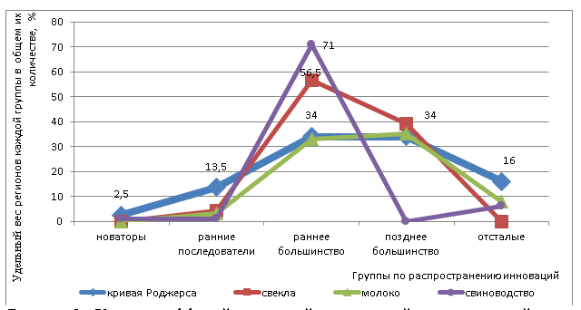 В более ранних исследованиях было выявлено влияние на отраслевое инновационное развитие процесса распространения инноваций (рисунок 3), которое показало более быстрое распространение инноваций в свиноводстве и свекловодстве.