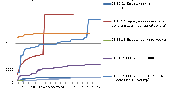 Рисунок 4 – Кумулятивные кривые платежей в связи с приобретением, созданием, модернизацией, реконструкцией и подготовкой к использованию внеоборотных активов наиболее крупными сельскохозяйственными организациями по видам деятельности