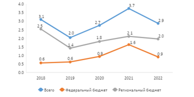 В целом за анализируемый период в структуре финансирования мер господдержки, основной удельный вес занимают средства регионального бюджета (68%) [14]. При этом наблюдается тенденция снижения доли регионального финансирования (с 81,9% в 2018 г. до 68,3% в 2022 г.) и увеличения доли федерального финансирования (с 18,1% в 2018 г. до 31,7% в 2022 г.) [15].