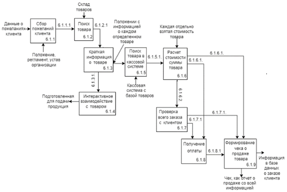 На рис. 2 показана схема информационных потоков подпроцесса «Продажа товаров». Входящие и выходящие стрелки означают выходные и входные информационные массивы.
