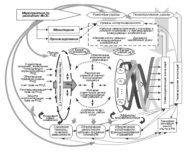 Необходимо отметить важность данной задачи в рамках программ обеспечения экономической безопасности на уровне государства. Формирование сбалансированной системы создания и трансфера технологий на основе РИД является одним из инструментов научно-технологического и в целом творческого развития при создании цифровой инфраструктуры, обеспечивающей формирование «сетей знаний» для взаимодействия исследователей, технологических предпринимателей и инвесторов в целях создания новых продуктов и услуг [6, 7]. Кроме того, локализация всех этапов цепочек создания стоимости высокотехнологичных продуктов, работ, услуг в рамках страны способствует росту ее устойчивости при реализации негативных внешних воздействий и тем самым, обеспечению технологического суверенитета и конкурентоспособности.