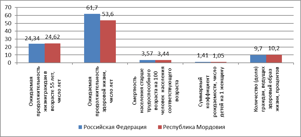 Показатели реализации проекта «Демография», показывают, что для Республики Мордовия положительны более высокие значения показателя «количество граждан, ведущих здоровый образ жизни» на 0,5 п.п., ниже смертность, но отрицательное значение у показателя более низкой рождаемости в расчете на 1 женщину.