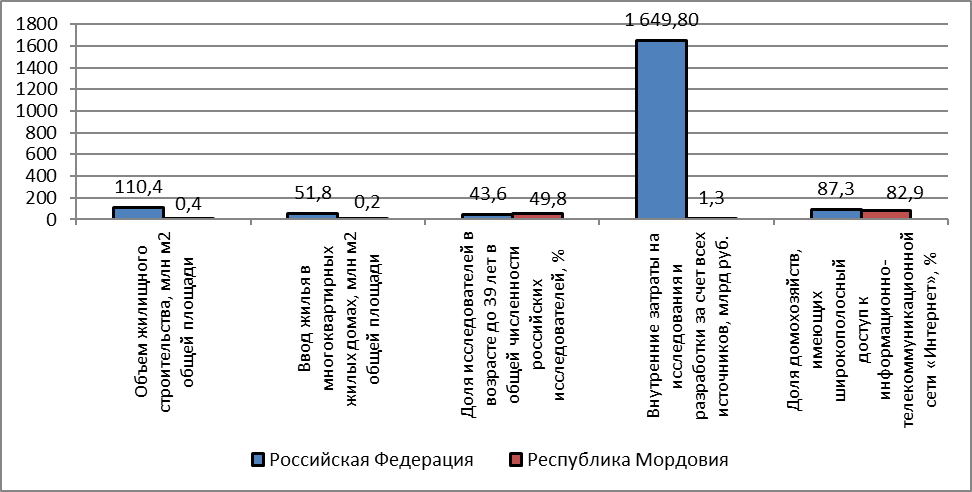 По проекту «Жилье и городская среда» в Республике Мордовия показатели неудовлетворительны, в разы ниже, чем показатели по Российской Федерации. По показателям «Наука» республика имеет более высокую долю молодых ученых, но очень низкий уровень внутренних затрат на исследования. Показатели проекта «Цифровая экономика» сопоставимы со среднероссийскими показателями.