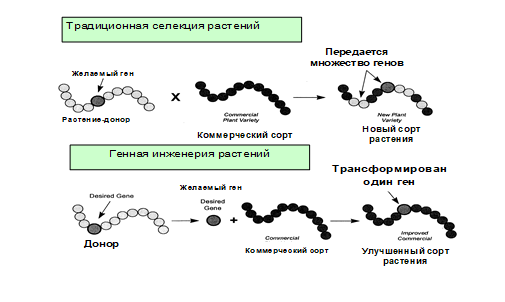Как видим, внедрение генов в ДНК растения-реципиента методами генной инженерии коренным образом отличается от комбинирования материнских и отцовских хромосом, происходящем при естественном скрещивании. Если в традиционной селекции путем скрещивания передается множество генов, то при генной инженерии передается только один желаемый ген, взятый у вида донора [10]. Однако, многие ученые считают, что искусственное добавление чужеродных генов сильно нарушает точно отрегулированный генетический контроль нормальной клетки [8].