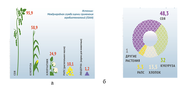 Рис. 2. Распространение ГМ-культур в мире, 2018 г.: а – площадь посевов под ГМ-культурами, млн.га; б – структура мирового производства ГМ-культур, % (данные Международной службы оценки применения агробиотехнологий (ISAAA)