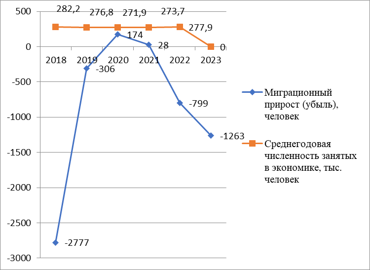 За рассматриваемый период показатель миграционного прироста максимального значения достиг в 2020 году (174 чел.), но в основном регистрируется миграционная убыль (при этом весьма показательны 2018 и 2023 годы). За период с 2018 по 2023 гг. среднегодовая численность занятых в экономике снизилась на 4,3 тысячи человек.