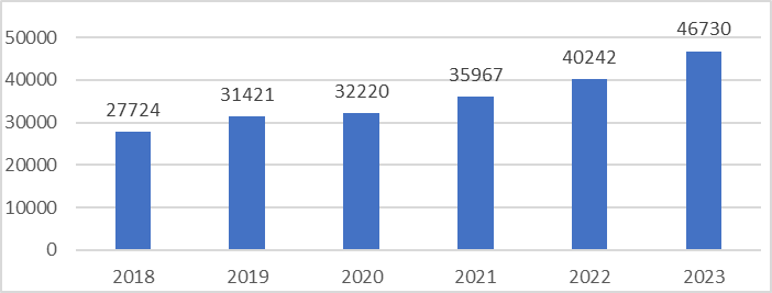 Среднемесячная номинальная начисленная заработная плата работников организаций за перевод исследования выросла на 19006 рублей. Заработная плата выросла за счёт индексации денежных средств на предприятиях для поддержания покупательной способности и реальных доходов сотрудников. Максимального значения показатель достиг в 2023 г., а минимального в 2018 году.
