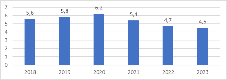 За рассматриваемый период уровень безработицы снизился на 1,3%, так как вырос уровень социальной поддержки населения государством, а также увеличилось количество вакансий на средних и малых предприятиях. Так же можно выделить и другие причины такого низкого уровня безработицы. Первым фактором может служить расширение производства в промышленности, а вторым фактором можно выделить сокращение рабочей силы за счёт мобилизации и привлечения добровольцев-контрактников и массовой релокации молодых квалифицированных специалистов. Максимального значения показатель достиг в 2020 году из-за пандемии, а минимального значения в 2023 году.