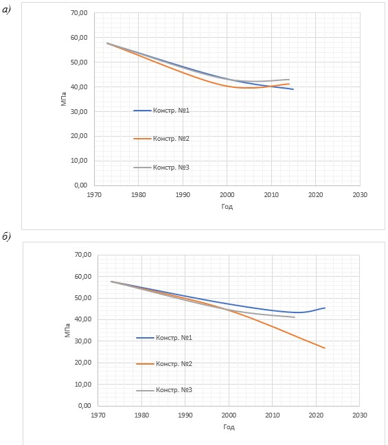 Ввиду отсутствия проектной документации проектное значение прочности бетона определялось исходя из прочности неподверженных коррозии конструкций. Для объекта №1 в железобетонных конструкциях применялся бетон класса В40. В случае невозможности установить такой тип конструкции принят минимальный класс бетона по прочности на сжатие В45 в соответствии с требованиями СП 28.13330.2017 как для бетонов, подверженных воздействию растворов органических кислот с индексом среды эксплуатации ХА3. В дальнейшем, зная несколько промежуточных значений прочности бетона, производилось определение начальной прочности бетона по выведенным зависимостям. Полученные результаты позволяют утверждать, что принятые величины начальной прочности бетона соответствуют действительности.