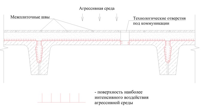 Сопоставив результаты испытаний конструкций плит перекрытия на открытых участках (как правило, нижняя поверхность плит перекрытия и внутренние стороны ребер) и на закрытых участках (верхняя поверхность плит, закрытая конструкцией пола), получим, что наиболее интенсивное воздействие агрессивной среды происходит на закрытых участках, где сохраняется водонасыщенное состояние конструкции пола. Наиболее интенсивное воздействие жидкой агрессивной среды на ребристую плиту перекрытия показано на рис. 3.