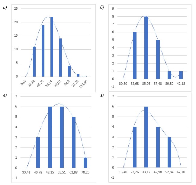 В ходе анализа данных результатов испытаний бетона подтверждается, что характер распределения величин результатов испытаний при увеличении количества измерений стремится к нормальному распределению (рис. 4). Ввиду малого (менее 30) кол-ва испытаний в большинстве категорий для определения прочности бетона на сжатие с обеспеченностью 0,95 используется критерий Стьюдента.