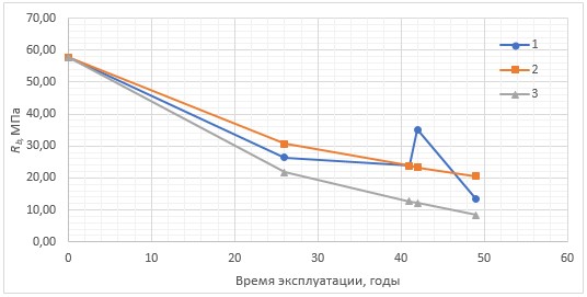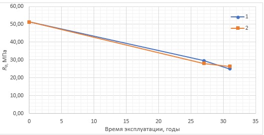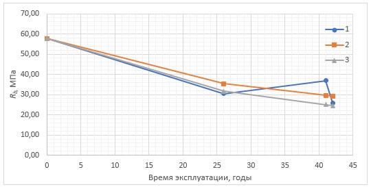 Исходя из данных, полученных в ходе анализа результатов обследований, определен характер деградации бетона и его параметры. Так, кривая прочности бетона описывается формулой (3):