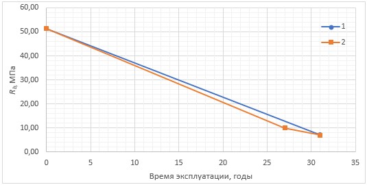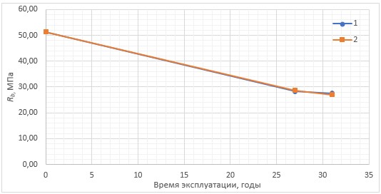 Рис. 4. Графики снижения прочности бетона конструкций в процессе эксплуатации: