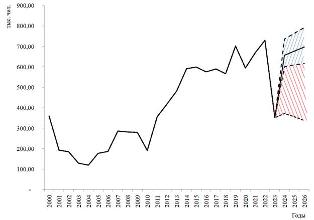 В результате всего выше изложенного, считаем, что наиболее вероятное значение для 2024г., количества мигрантов, прибывающих из зарубежных стран составит 656 тыс. чел., с последующим ростом значения на 3% в год. Возможный размах вариации от прогнозного значения составляет от 8% в сторону уменьшения и до 14% в сторону увеличения.